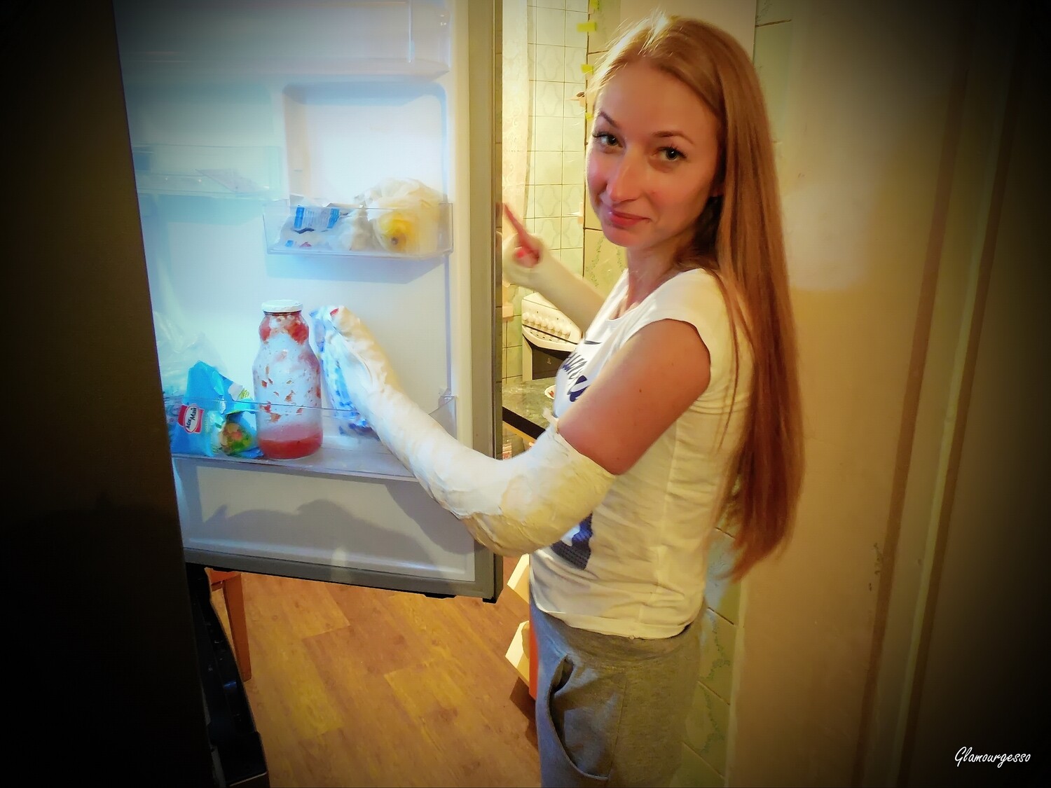 She shows you how to be a sexy housewife with her casted arms at home, prepares for a party, has fun and drinks despite her severe immobilization.