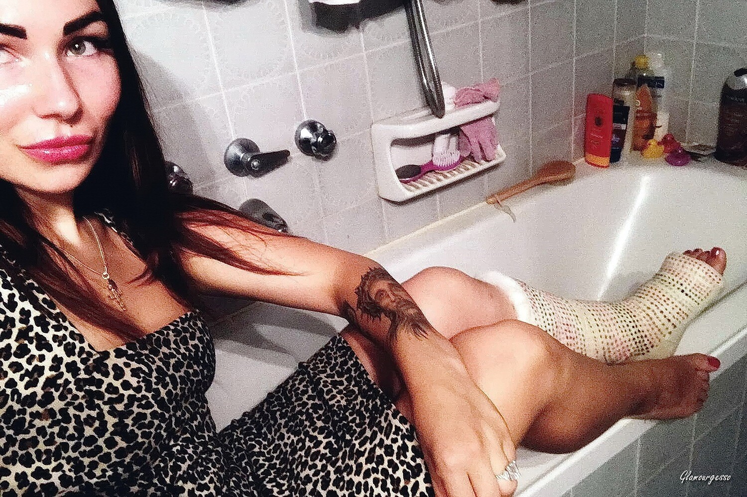 Russian professional model Polina wears her *medical* SLC after breaking two bones in her left foot falling down her motorcycle in Milano in July 2019.